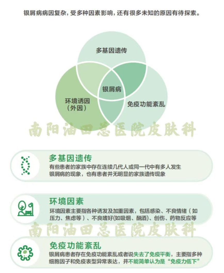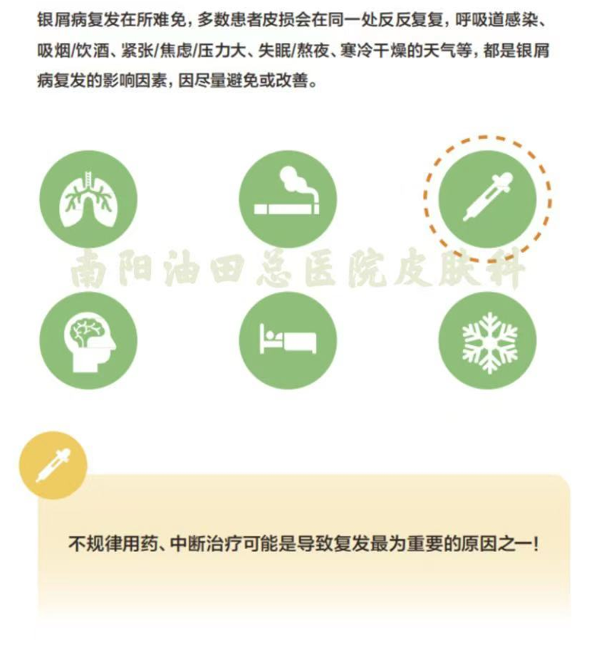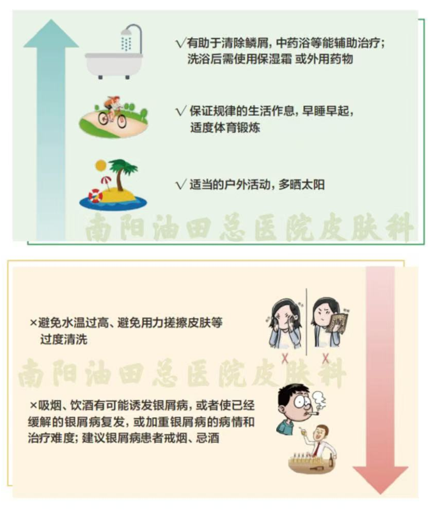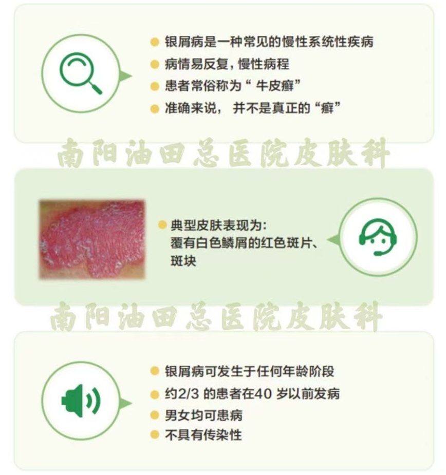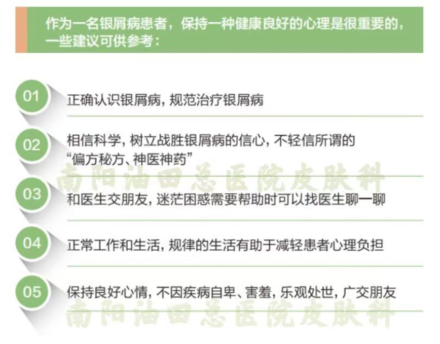 世界银屑病日 油田总医院皮肤科与您携手并肩 NO.1 关于世界银屑病日 2004年,国际银屑病协会联合会(简称:IFPA)确定每年的10月29日定为“世界银屑病日” (World Psoriasis Day)。 IFPA呼吁:全世界各国应提高人们对银屑病及其患者以正确认识,给予银屑病患者更多关注与尊重。 2024年10月29日是第21个“世界银屑病日”,今天银屑病的治疗方法比以往任何时候都要好,所有的银屑病患者在应该在合适的时间接受合适的治疗。 NO.2 什么是银屑病? NO.3 为什么会得银屑病? NO.4 银屑病有哪些类型? NO.5 银屑病常用的治疗方法/药物 NO.6 如何管理好您的银屑病? NO.7银屑病需要忌口吗? NO.8 如何减少银屑病复发? NO.9银屑病生活护理小建议 NO.10 重视心理健康管理 希望银屑病患者可以和医生加强沟通交流。对疾病的疑问,对治疗的困惑,对期望达到的治疗效果,以及个人对治疗的需求等等,都可以来南阳油田总医院门诊3楼皮肤科与医生充分沟通,为您量身定制个体化的治疗方案。 让我们携手并肩,共同关注银屑病,管理银屑病,一起迎接新的美好生活!